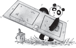 Nothing I can do about that, thought Ping. That’s the problem with surfing – everything gets wet… my face, my legs, my feet, the board, the paint. He noticed that the fat ranger was waving a paintbrush. “Oh, I see what you mean!” gasped Ping, lifting up his feet to discover that underneath they were bright green. “You mean the paint’s still wet. Sorry!” he cried as he sailed past. “I’ll have the door back in two shakes of a cat’s tail.”