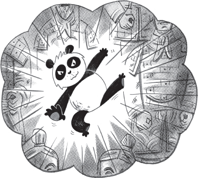 “Then it’s lucky I’m here!” roared Ping, spinning round, waggling his bottom andblowing a raspberry at Stinkie McScar through his legs. Inflamed by the panda cub’s insult, the bandits charged, but just as they were within striking distance, Ping grabbed the Emperor for a second time and somersaulted off the mound.