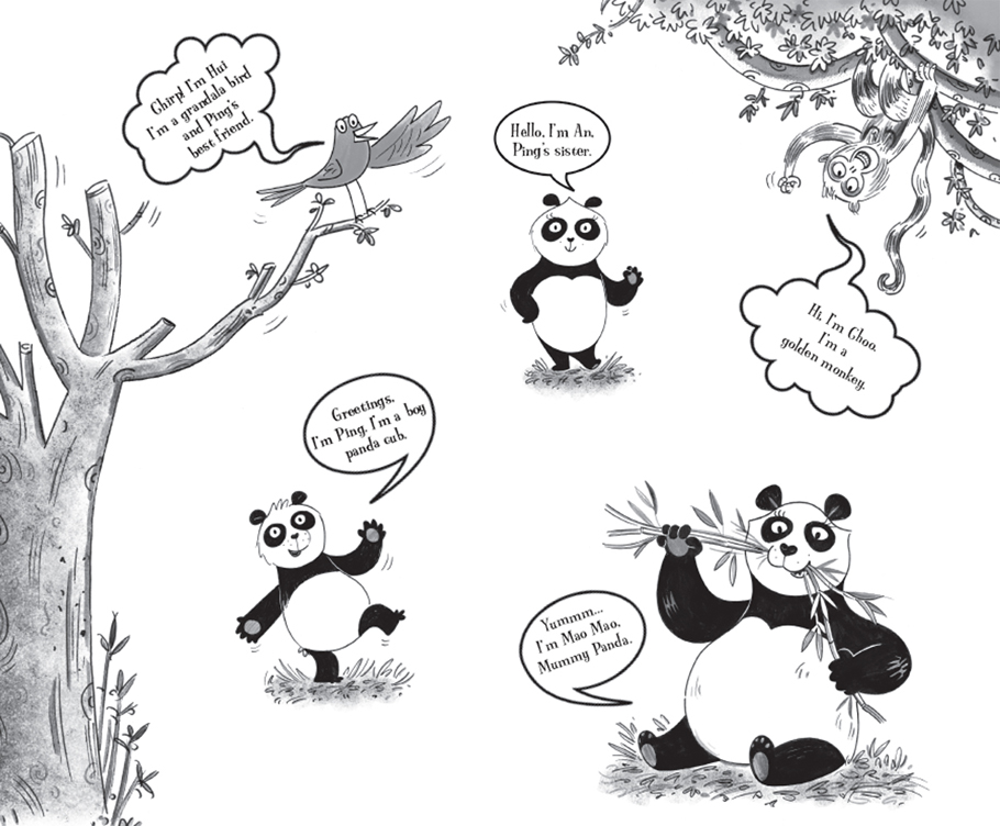 “Oh, look,” screamed Choo, their oh-so-witty leader. “A weird new animal’s come to live in the forest… It’s a giant black and white snail.” The other monkeys laughed, while a cocky young monkey called Foo approached Ping and sniffed him.