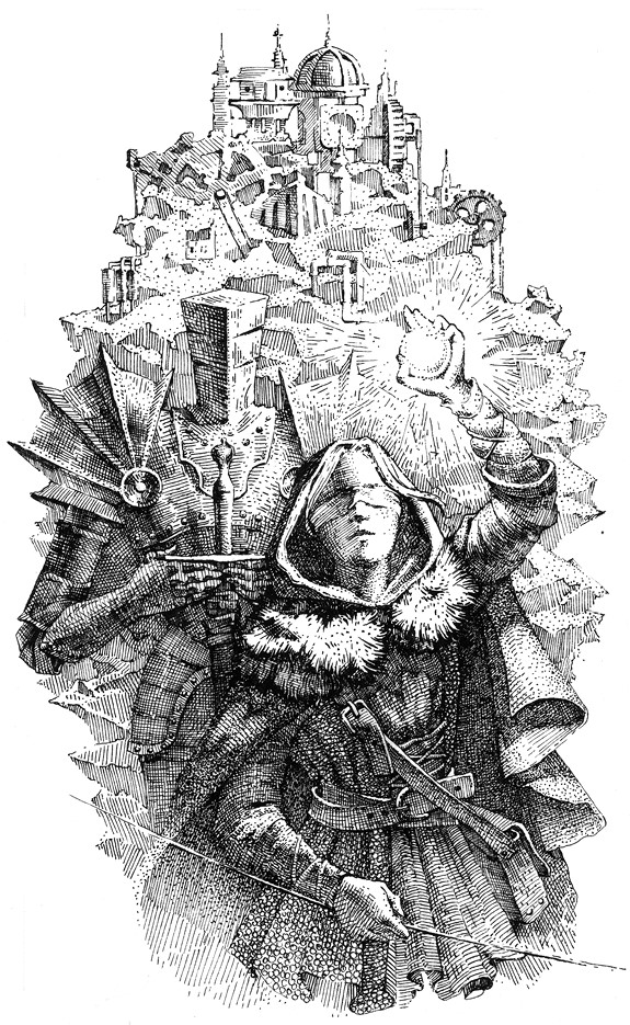 Встречал каменный мертвец свою измученную гостью распахнутыми вратами, что едва слышно скрипели по воле ветра. Зань подняла взгляд: ещё выше, почти у небосвода, средь белых скал сияли гранитные диски. То были гигантские шестерни неведомого предназначения, уходящие глубоко в горные породы и движения всякого лишённые. Зань с неясным себе чувством обратилась к сиимцам: