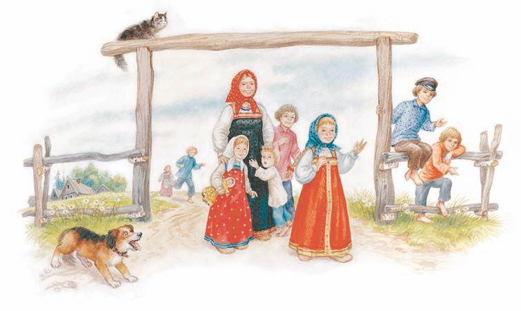 Выбежали дети на крыльцо, а там уже много народу собралось. Нижегородский мужик, с большим колом в руках, держит на цепи медведя, а мальчик приготовился в барабан бить.