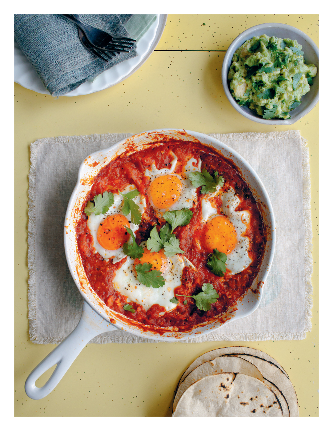 I make this dish a lot. It’s the one thing I order without fail at breakfast tables in America. The holy trio of eggs, tomatoes and avocado never fails me. It mostly crops up at my house mid-morning on a Saturday, after a walk to the shop for the paper.