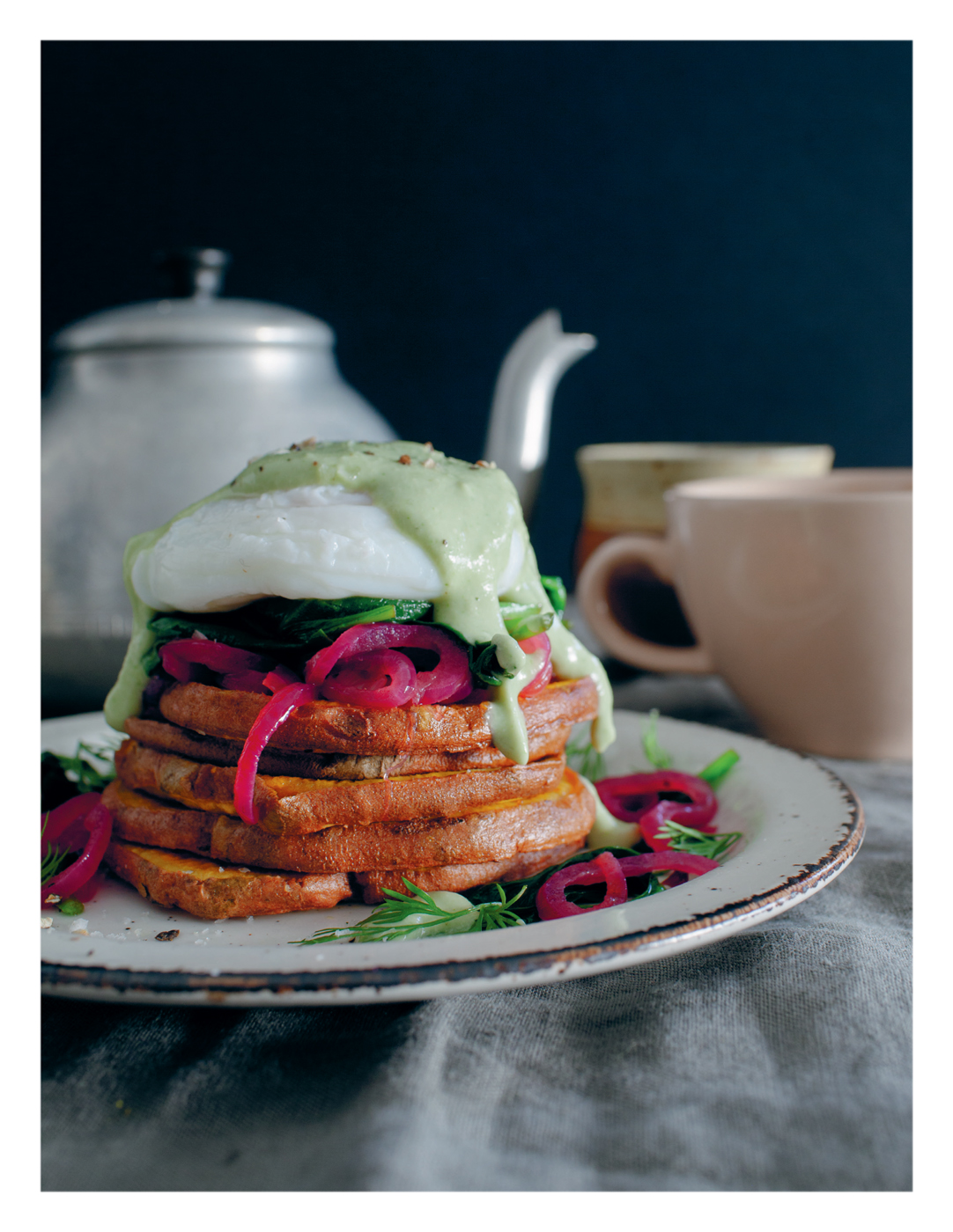 I’m not sure I know anyone who doesn’t like eggs Benedict, in all its rich hollandaise glory. This is how I make mine. Roasted slices of sweet potato step in for muffins, and avocado and cashews whiz up creamily in seconds with a bit of tarragon to make a killer super-light hollandaise, creamy but not too rich. The sticky onions and spinach sandwich it all together.