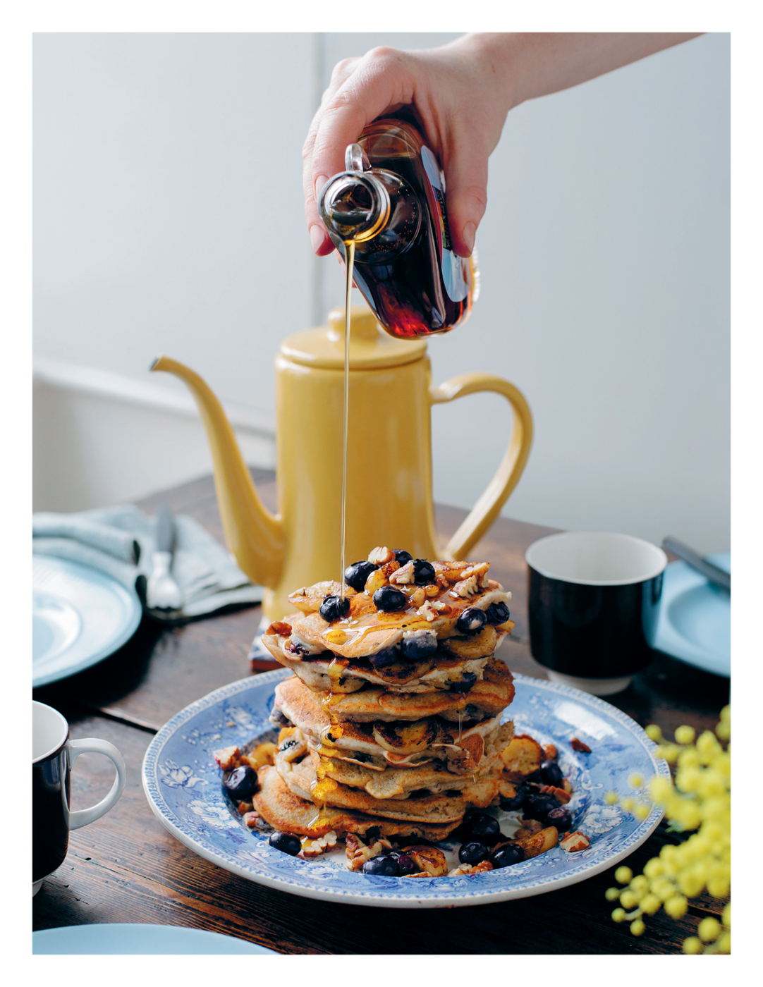 Put the pan back on a medium heat and add a little coconut oil or butter. Drop in a healthy tablespoonful of batter for each pancake. Once the sides are cooked and bubbles have risen to the top, scatter over a handful of blueberries and flip the pancake over. Cook for another couple of minutes on the other side. The pancakes will stay a little moist in the middle because of the banana, so don’t worry. Keep them warm in the oven while you cook the rest.