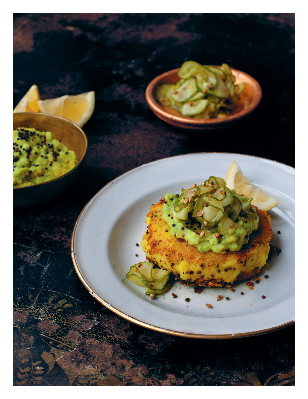 Serve each dosa cake piled with the mustard seed, onion and mashed avocado and with a sprightly spoonful of pickle on the side.