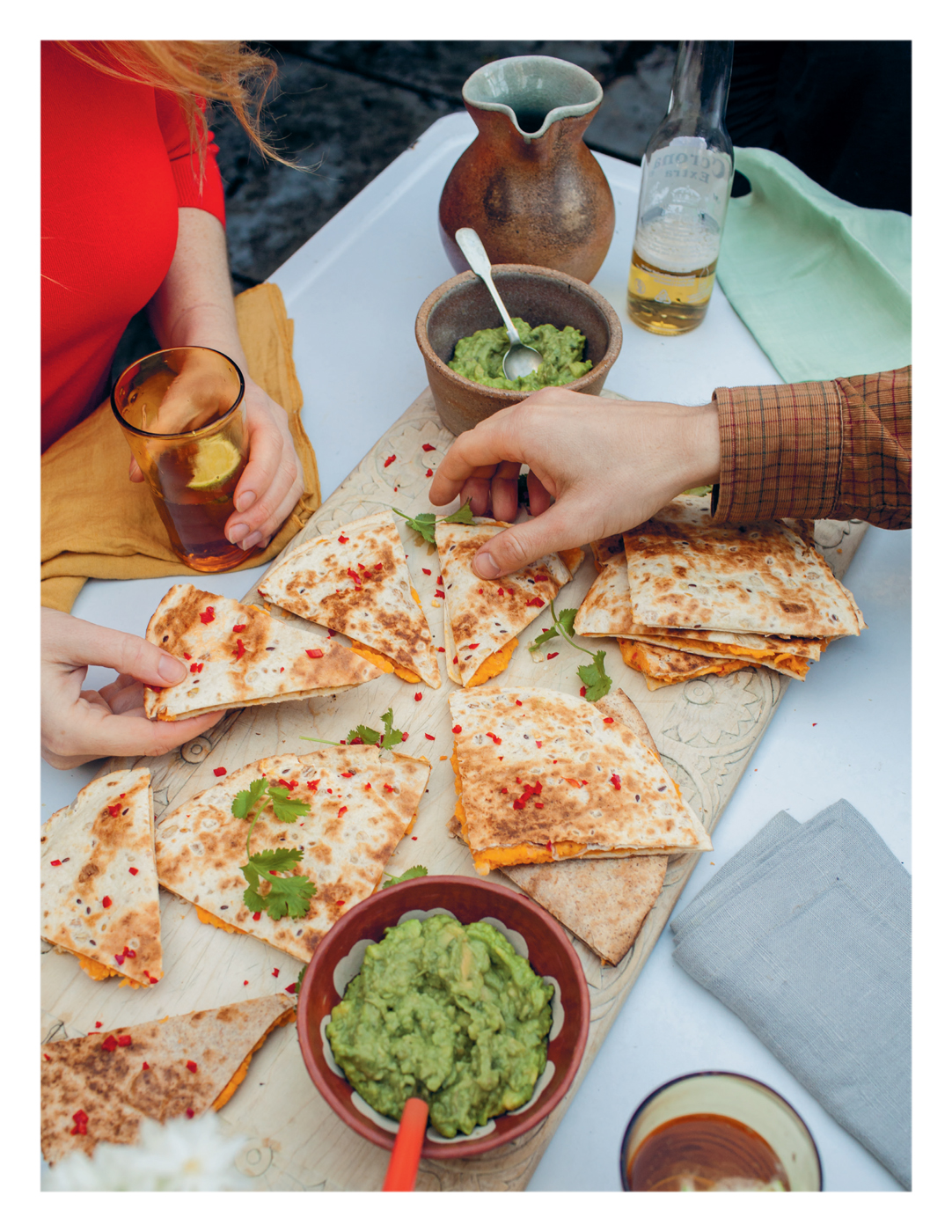 Now heat a frying pan big enough for your tortillas. Lay a tortilla flat in the pan, spoon a quarter of the mixture on to one half of it, then fold over the other half. Dry fry on one side until it’s blistered and golden brown, then flip over and do the same on the other side. Keep the quesadilla warm while you do this with the rest of the tortillas.