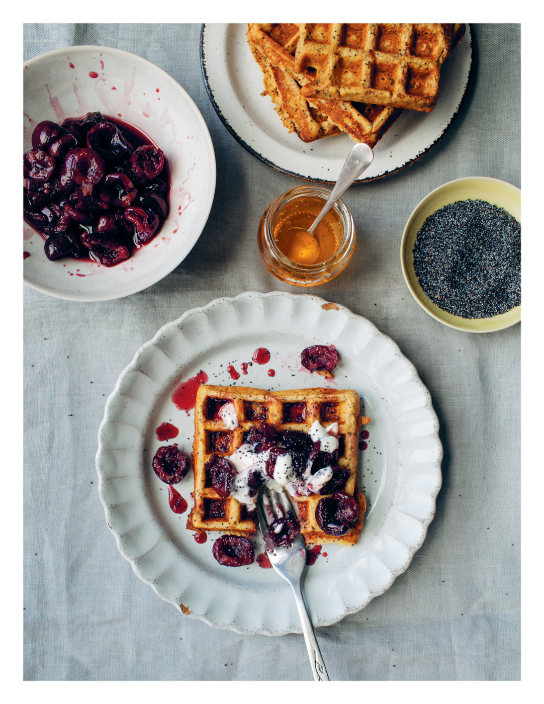 Like bottomless coffee and inch-deep maple syrup and waitresses with name badges, waffles are very American territory to me. I started making them at home last year – I bought a £20 waffle iron and I haven’t looked back, as there is something so good about their crispy chequered exterior. They are quick and easy to make and more consistent than pancakes, and the waffle iron stays squeaky clean, so no washing up. This is my poppy seed-flecked version. I make these waffles with a mixture of oats or quinoa, whizzed to a floury dust in the food processor, but straight up wholemeal flour works well too.