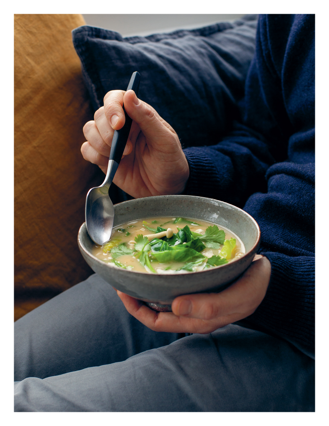 Ladle the soup into bowls and top with the roughly chopped coriander leaves. I like the neatness of this simple, soothing soup on its own, but if you are hungry, try adding some cooked soba noodles.
