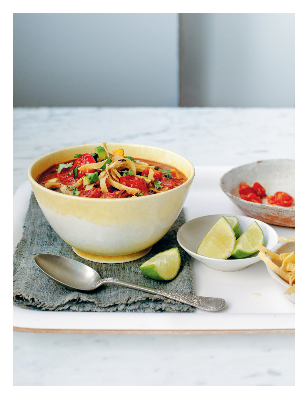 Once the tortilla strips are golden, take them out of the oven. Ladle the soup into bowls, top with the roasted tomatoes and crunchy tortilla strips, a poached egg, some chopped avocado, if you like, and a scattering of coriander.