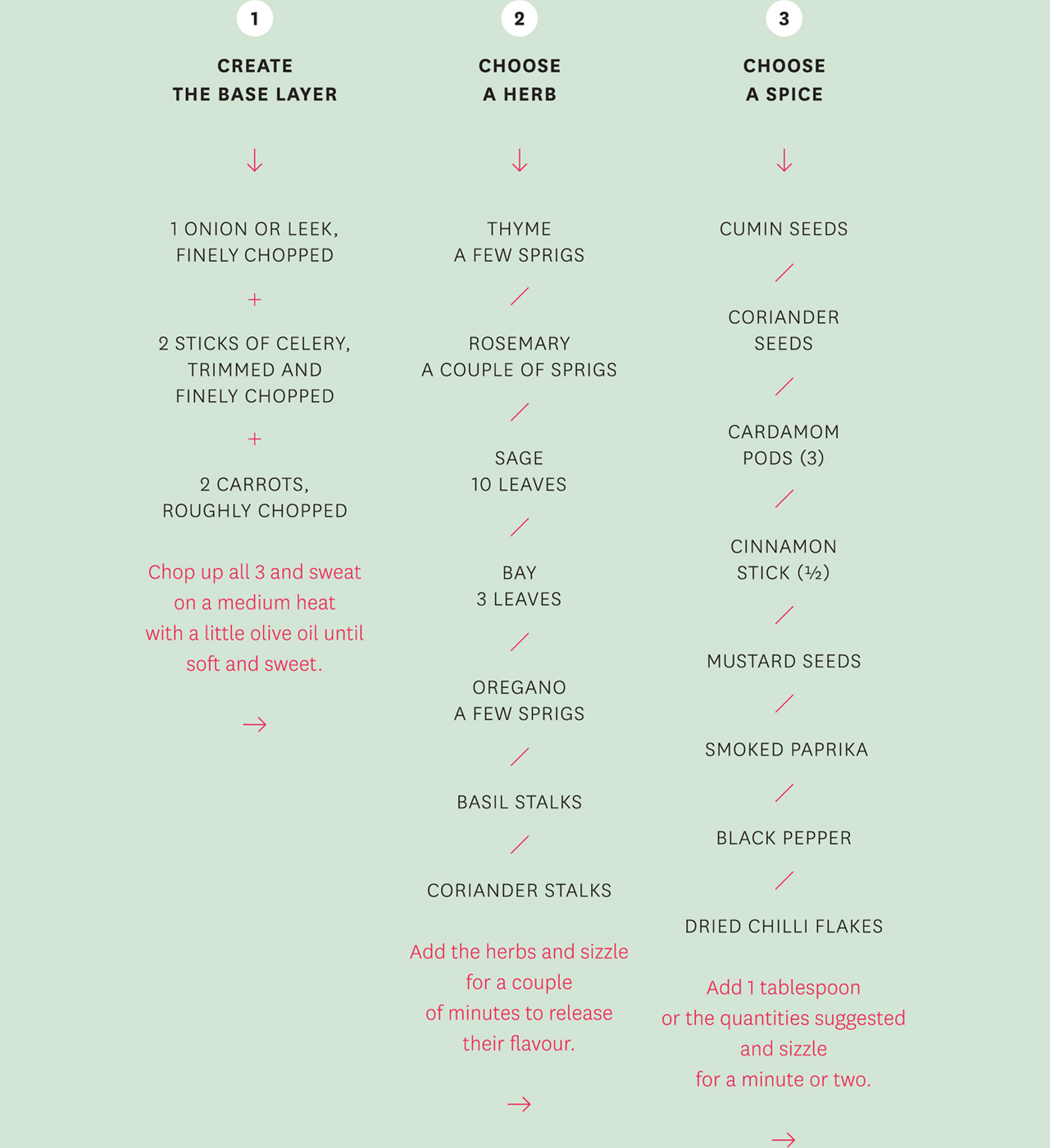 Next, add the lentils, 1.5 litres of water and the stock cube or powder and allow to bubble away for 20–35 minutes, until the lentils are cooked and the soup has thickened.