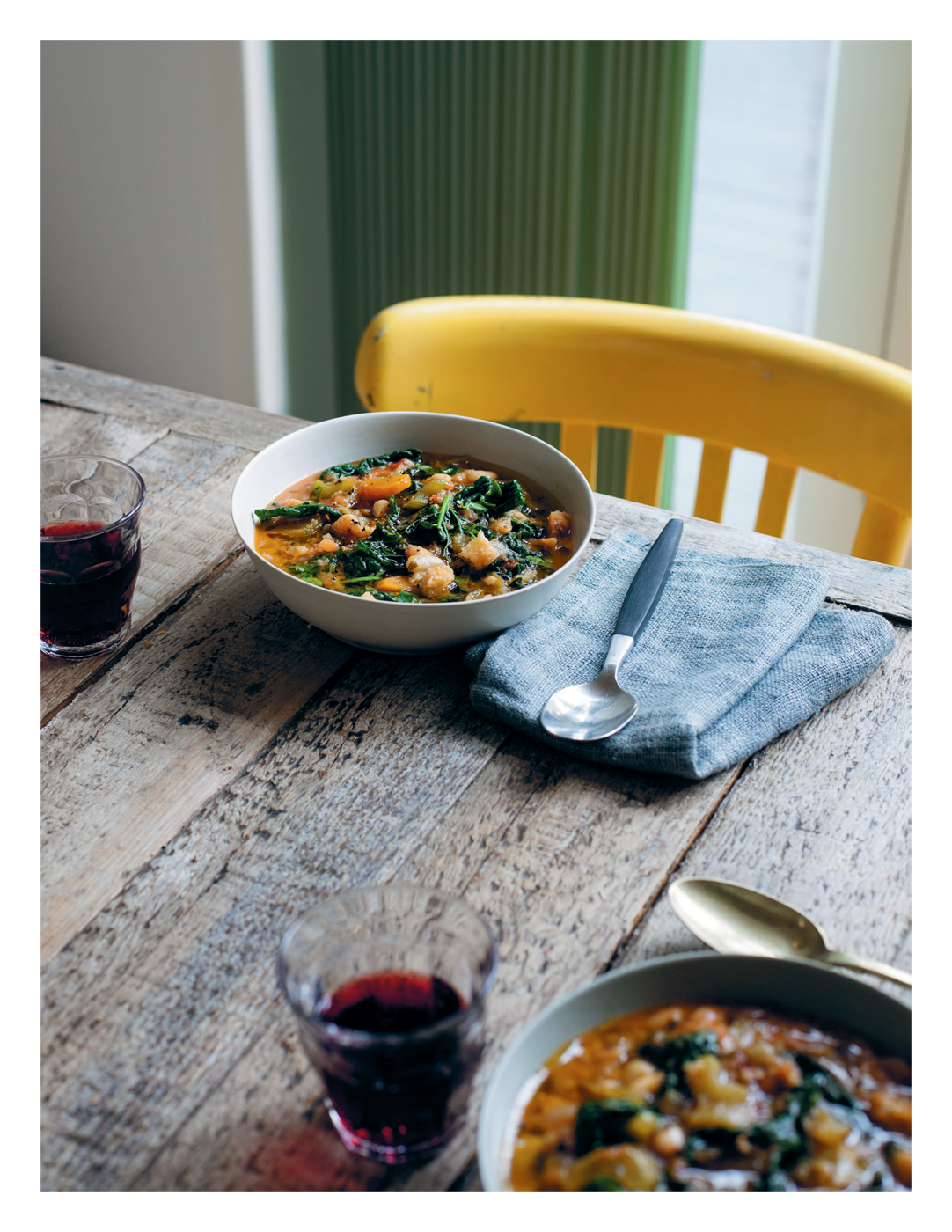 This is an autumn version. In summer I use chard or spinach in place of the cavolo and squashed fresh tomatoes instead of tinned ones. I use tinned beans here for ease, but you could cook your own too.