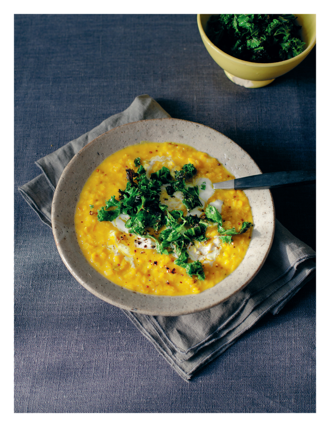 Ladle into bowls and top with the salted yoghurt and the crispy kale.