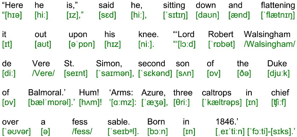 “Then I have just time, with your assistance, to get clear upon the subject. Turn over those papers and arrange the extracts in their order of time, while I take a glance as to who our client is.” He picked a red-covered volume from a line of books of reference beside the mantelpiece. “Here he is,” said he, sitting down and flattening it out upon his knee. “‘Lord Robert Walsingham de Vere St. Simon, second son of the Duke of Balmoral.’ Hum! ‘Arms: Azure, three caltrops in chief over a fess sable. Born in 1846.’ He’s forty-one years of age, which is mature for marriage. Was Under-Secretary for the colonies in a late administration. The Duke, his father, was at one time Secretary for Foreign Affairs. They inherit Plantagenet blood by direct descent, and Tudor on the distaff side. Ha! Well, there is nothing very instructive in all this. I think that I must turn to you Watson, for something more solid.”