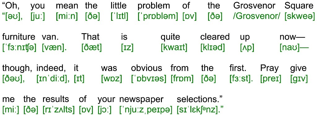 “Oh, you mean the little problem of the Grosvenor Square furniture van. That is quite cleared up now—though, indeed, it was obvious from the first. Pray give me the results of your newspaper selections.”
