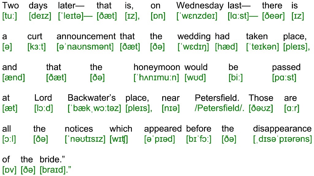 “‘The ceremony, which was performed at St. George’s, Hanover Square, was a very quiet one, no one being present save the father of the bride, Mr. Aloysius Doran, the Duchess of Balmoral, Lord Backwater, Lord Eustace and Lady Clara St. Simon (the younger brother and sister of the bridegroom), and Lady Alicia Whittington. The whole party proceeded afterwards to the house of Mr. Aloysius Doran, at Lancaster Gate, where breakfast had been prepared. It appears that some little trouble was caused by a woman, whose name has not been ascertained, who endeavoured to force her way into the house after the bridal party, alleging that she had some claim upon Lord St. Simon. It was only after a painful and prolonged scene that she was ejected by the butler and the footman. The bride, who had fortunately entered the house before this unpleasant interruption, had sat down to breakfast with the rest, when she complained of a sudden indisposition and retired to her room. Her prolonged absence having caused some comment, her father followed her, but learned from her maid that she had only come up to her chamber for an instant, caught up an ulster and bonnet, and hurried down to the passage. One of the footmen declared that he had seen a lady leave the house thus apparelled, but had refused to credit that it was his mistress, believing her to be with the company. On ascertaining that his daughter had disappeared, Mr. Aloysius Doran, in conjunction with the bridegroom, instantly put themselves in communication with the police, and very energetic inquiries are being made, which will probably result in a speedy clearing up of this very singular business. Up to a late hour last night, however, nothing had transpired as to the whereabouts of the missing lady. There are rumours of foul play in the matter, and it is said that the police have caused the arrest of the woman who had caused the original disturbance, in the belief that, from jealousy or some other motive, she may have been concerned in the strange disappearance of the bride.’”
