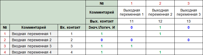 Для начала рассмотрим таблицу, показанную на рис. 1. Нумерованные строки таблицы отвечают за входы контроллера, а нумерованные столбцы – за выходы. Состояние каждого входа контроллера описывается входной переменной, которая получает значение, равное логическому уровню на соответствующем ей входе. А логические уровни на выходах контроллера получают значения своих выходных переменных. Состояние каждой выходной переменной будем определять как логическое И в столбце под ней. Чтобы задать зависимость выходной переменной от нескольких входных переменных, продублируем значения входных переменных в ячейки под выходной переменной.