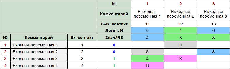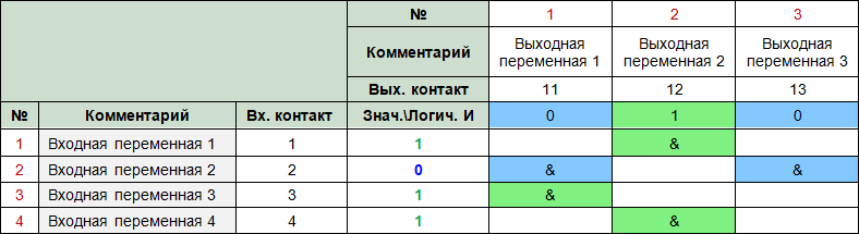 В результате поисков удобного формата таблицы, который бы легко воспринимался специалистом, не писавшим программу, из всех возможных операций в столбце было оставлено только логическое И. Это сделано для удобства быстрого анализа состояния программы в таблице. Если в столбце хоть одна активная ячейка принимает значение ноль, то результат тоже будет ноль. Если все активные ячейки столбца будут равны единице, то выходная переменная над столбцом также будет равна единице. Выделение синим цветом ячеек, находящихся в состоянии «Ноль», и зеленым цветом ячеек в состоянии «Единица» помогает увидеть всю картину целиком, быстро найти ячейки, цвет которых не соответствует ожиданиям.