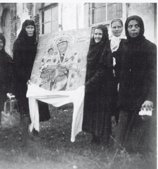 Почитаемая святыня Болхова, чудотворная икона «Взыскание погибших». Болхов, лето 1950 года (подпись под фотографией сделана отцом Василием, архив О. В. Ермаковой)