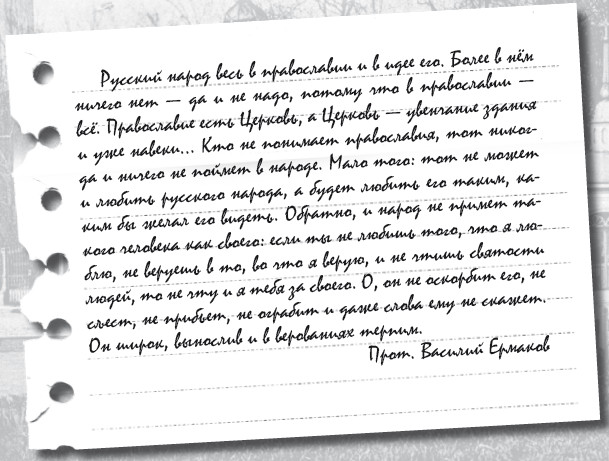 Русский народ весь в православии и в идее его. Более в нём ничего нет – да и не надо, потому что в православии – всё. Православие есть Церковь, а Церковь – увенчание здания и уже навеки… Кто не понимает православия, тот никогда и ничего не поймет в народе. Мало того: тот не может и любить русского народа, а будет любить его таким, каким бы желал его видеть. Обратно, и народ не примет такого человека как своего: если ты не любишь того, что я люблю, не веруешь в то, во что я верую, и не чтишь святости людей, то не чту и я тебя за своего. О, он не оскорбит его, не съест, не прибьет, не ограбит и даже слова ему не скажет. Он широк, вынослив и в верованиях терпим.