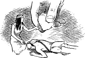 Omri flooded a bit of the cotton-wool from the box with the disinfectant and handed it to Twin Stars, making swabbing gestures to show her what it was for. She caught on quickly. With light, delicate strokes she cleaned the blood off Little Bull’s back. No more seemed to be coming from the holes. Omri, remembering that injured people have to be kept warm, and noticing that Twin Stars was shivering, snatched up one of the gloves he’d worn to school and recklessly cut the little finger off it with some scissors. The Indian was soon inside the woollen finger, which was like a sleeping-bag. Omri and Twin Stars looked at each other.