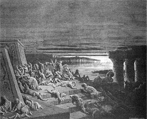 Тогда Моисей, по повелению Божию, навел на Египет последовательно десять казней, то есть великих бедствий, чтобы фараон согласился отпустить еврейский народ из земли египетской. Так, по слову Моисея, вода в реках, озерах и колодцах превращалась в кровь; град и саранча истребляли растительность; наступила трехдневная тьма по всему Египту и т. п. Но, несмотря на такие бедствия, фараон все же не отпускал евреев. Он, начиная со второй казни, каждый раз призывал Моисея, просил его помолиться Господу и прекратить бедствие и обещал отпустить евреев; но как только казнь прекращалась, фараон снова ожесточался и отказывался отпустить их. Тогда наступила последняя, десятая, самая страшная казнь.