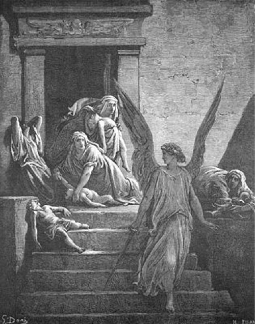 В эту ночь ангел Господень поразил всех первенцев в Египте, от человека до скота. Он прошел мимо только тех домов, на дверях которых был сделан знак кровью. (Первенцем назывался первый, то есть старший сын). По всему Египту поднялся плач. Фараон призвал тогда Моисея и велел ему скорее уходить с народом еврейским из Египта.