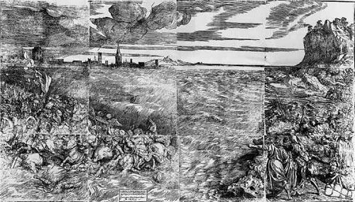 Евреи, по выходе из Египта, направились к Чермному, или Красному морю. Египтяне же, похоронивши умерших первенцев, стали жалеть, что отпустили евреев. Фараон, собрав войско с колесницами и всадниками, отправился в погоню за евреями. Он догнал их у берега моря. Увидев позади себя грозные полчища фараона, евреи пришли в ужас. Вместо того чтобы просить у Бога помощи, они стали роптать на Моисея за то, что он вывел их из Египта. Ободряя их, Моисей в душе своей молился Богу. Господь услышал его молитву. Облачный столп стал позади евреев и скрыл их от египтян. Господь сказал Моисею: «возьми жезл твой, простри руку твою на море и раздели его». Моисей протянул руку свою с жезлом на море. И поднял Господь сильный восточный ветер на всю ночь, и расступились воды. И пошли евреи по сухому дну, вода же была им стеною по правую и по левую сторону. Слыша в стане еврейском движение, египтяне погнались за евреями по дну морскому и уже достигли середины моря. В это время евреи вышли на другой берег. Моисей снова, по повелению Божию, простер руку свою с жезлом на море. Вода морская слилась и покрыла колесницы и всадников всего войска фараонова, и потопила египтян.