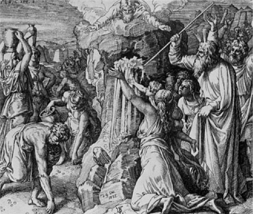 А когда евреи в пустыне пришли на место, называемое Рефидим, где совсем не было воды, то снова начали роптать на Моисея. По повелению Божию, Моисей ударил жезлом по каменной скале, и из нее потекла вода.