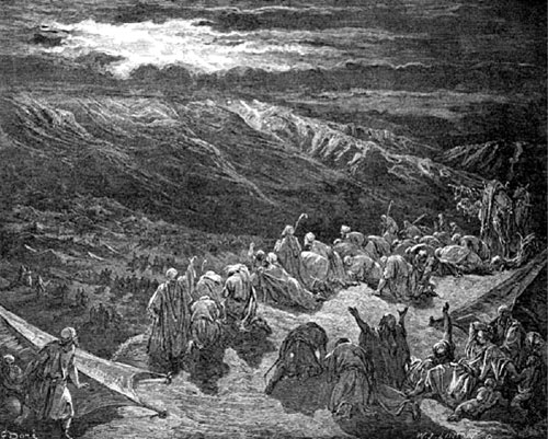 От горы Синая евреи двинулись к земле обетованной (Ханаанской). В пути евреи не один раз поднимали ропот (недовольство и обиду) на свое путешествие. Господь за это наказывал их, но по молитвам Моисея миловал их.
