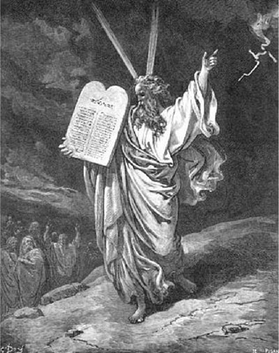 По повелению Божию Моисей взошел на гору и пробыл там сорок дней и сорок ночей, без всякой пищи. Бог дал ему две скрижали, или каменные доски, на которых были написаны десять заповедей. Кроме того, Господь дал Моисею и другие законы церковные и гражданские. Повелел Он также устроить скинию, то есть переносный храм Божий.