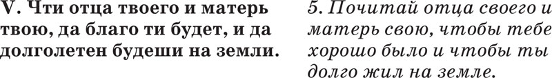 Должно любить и уважать родителей, слушаться их добрых наставлений и советов, заботиться о них в болезнях, быть опорою им в старости и нуждах, также должно почитать прочих родственников, старших, благодетелей, учителей, духовных отцов и начальников; за это Бог обещает продлить земную жизнь.