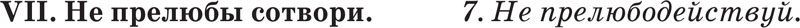 Этой заповедью Господь запрещает мужу и жене нарушать взаимную верность и любовь. Неженатым же Бог повелевает соблюдать чистоту мыслей и желаний. Обжорство, пьянство и вообще всякое излишество и необузданность также запрещаются этой заповедью.