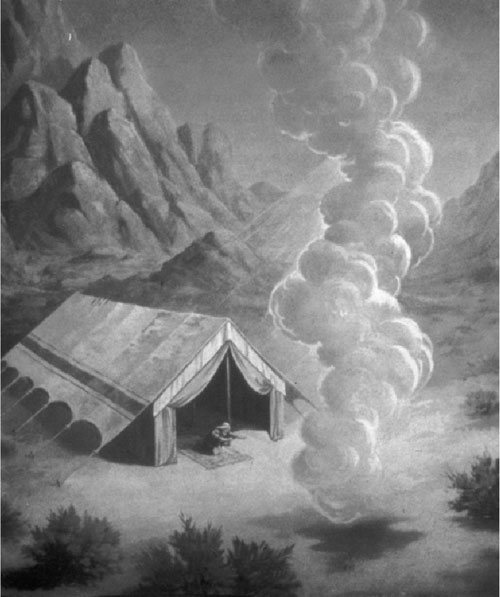 Когда скиния была готова, Моисей освятил ее, со всеми ее принадлежностями, священным миром. При этом слава Господня, в виде облака, сопровождавшего евреев в пути, покрыла скинию, и с того времени всегда находилась над нею.