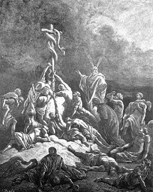 Однажды за свой ропот на Бога евреи были наказаны появлением множества ядовитых змей, которые жалили народ, так что многие умирали. Евреи раскаялись и просили Моисея помолиться о них Богу. Господь повелел Моисею сделать медного змия и повесить его на знамя. И кто из ужаленных смотрел с верою на медного змия, тот оставался жив.