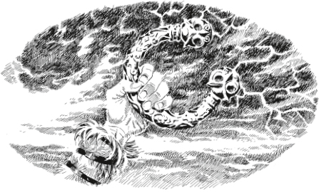 Adara’s head whipped round. She found herself face to face with a small Dorig – a very small Dorig, no bigger than she was – who was kneeling beside her on the track. His eyes were browner than the dead Dorig’s, and he had a stouter, fiercer look, but she could see a family likeness between them. This one was obviously much younger. He did not seem to have grown scales yet. His pale body was clothed in a silvery sort of robe and the gold collar on his neck was a plain, simple band, suitable for somebody very young. Adara knew he could not possibly harm her, but she was still horrified to see him.