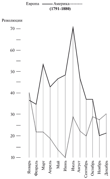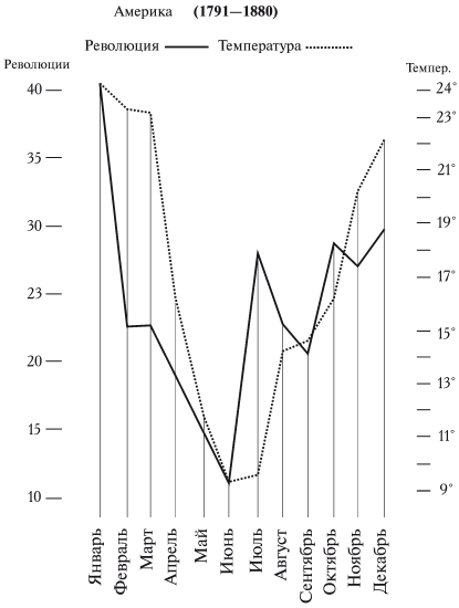 В Европе и Америке максимум количества бунтов неоспоримо падает на жаркие месяцы: в Европе – на июль, а в Южной Америке – на январь, который там по температуре соответствует нашему июлю. Минимум в Европе падает на ноябрь и декабрь, а в Америке на май и июнь.