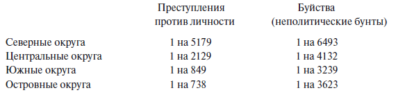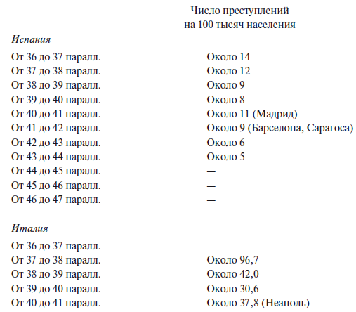 В самом деле, мы видели, что в Италии, например, в северных округах приходится 27 бунтов на 10 миллионов жителей, в центральных – 32 и в южных – 33. Но точно так же в ней распределяются и преступления против личностей, насилия, буйства и прочие, как это видно из следующей таблицы: