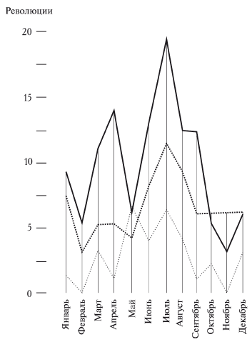1) Время года. Для того чтобы доказать могучее влияние тепла на народные восстания, я мог бы сослаться на выведенные уже мной отношения между бунтами и временами года, которые показывают, что в общем теплые и жаркие месяцы дают высшие цифры как для восстания, так и для политических преступлений. Но так как старые мои работы благодаря трудности самостоятельного собирания однородного материала дали повод к справедливой критике, то теперь я обращусь уже к материалам вполне достоверным, официальным, то есть для нашего времени – к «Готскому Альманаху» 1791–1880 годов, а для древних и Средних веков – к источникам, известным своею точностью.