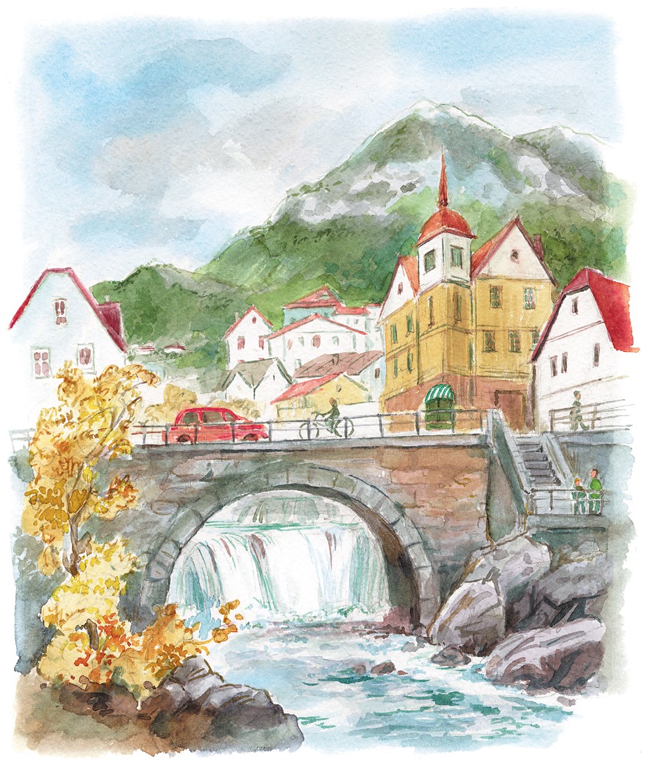Второй достопримечательностью был водопад. С вершины горы стекало множество ручьёв и ручейков, они сливались в реку, и река текла в город. Кое-где она текла медленно и спокойно, а кое-где яростно бросалась со скал и уступов, встречавшихся ей на пути. Это и были водопады.