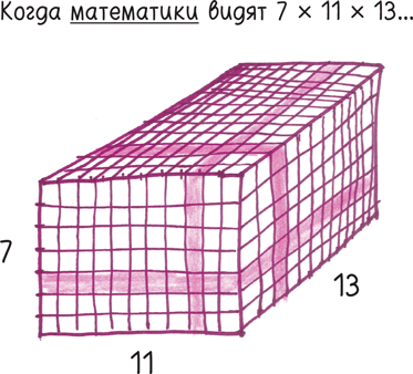Как показано на рисунке на предыдущей странице, умножение сводится к сеткам и массивам. Число 1001 можно рассматривать в качестве гигантской конструкции из кубиков: 7 в ширину, 11 в длину и 13 в высоту. Но это только начало. Вы можете представить это число как 11 слоев из 91 кубика каждый, а если вы наклоните голову, то увидите 7 слоев по 143 кубика в каждом. Все эти способы разложения числа 1001 становятся очевидны благодаря факторизации. Но почти невозможно разобрать это число без кропотливых вычислений, просто глядя на сочетание цифр.