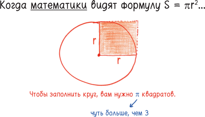 Возьмем формулу S = πR², которую многие школьники слышат так часто, что фраза «площадь круга» вызывает у них рефлекторное желание закричать: «Пи эр квадрат!» Они как агенты глубокого внедрения с промытыми мозгами. Но что значит эта формула? Почему это так?