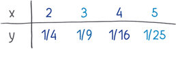 Возьмем уравнение, приведенное выше: y = 1/x². Здесь x и y – пара взаимосвязанных чисел. Вот несколько примеров: