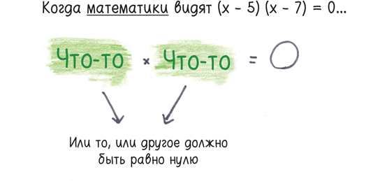 Здесь окупается наша стратегия дробления: один из множителей равен нулю. Таким образом, x равен либо 5, либо 7.