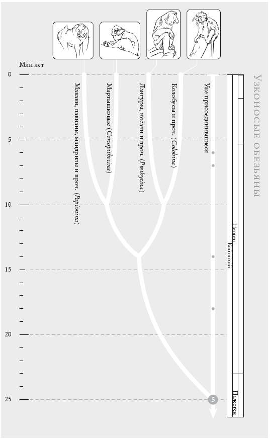 Был ли у сопредка № 5 хвост? Скорее всего, да. Поскольку отсутствие хвоста – это самый наглядный признак человекообразных обезьян, очень хочется сделать вывод, что разделение двух ветвей 25 млн лет назад совпадает со временем утраты хвоста. На самом деле сопредок № 5 был, по-видимому, хвостатым, как и почти все млекопитающие, а сопредок № 4 – бесхвостым, как и все его потомки, современные человекообразные обезьяны. Но в какой момент между сопредками №№ 4 и 5 утрачен хвост, мы не знаем. Это, впрочем, не так важно: мы же не думаем, что обычная обезьяна, утратив хвост, вдруг стала человекообразной. Африканский ископаемый род Proconsul, например, тоже вполне может считаться человекообразной, а не обычной, обезьяной, потому что после разделения двух ветвей в момент рандеву № 5 он оказался на стороне человекообразных обезьян. Но то, что он относится к линии человекообразных обезьян, еще не проясняет вопрос о наличии хвоста. (Данные в совокупности указывают на то, что у проконсула хвоста не было.)