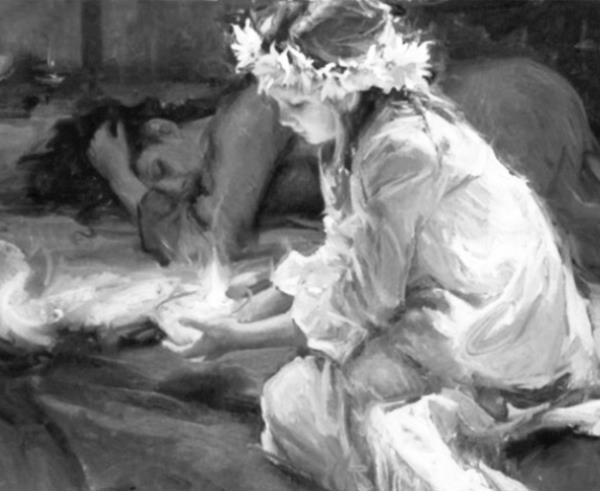 Сияние огня заманчиво и зыбко,Змеиный язычок танцует на свече.В его игре теней как будто пенье скрипки,И магия цветов дрожит в его луче.И девочка в венке свои распустит косы,Блестящий огонек скользнет ей по лицу.А за окном в траве рассыплют капли росы,Как хрусталем одев цветочную пыльцу.И пока мама спит, танцует свечки пламя,И магия огня колдует наяву.Но скоро ночь пройдет немного сердце раня,И утренний рассвет придет на рандеву.Половинки
