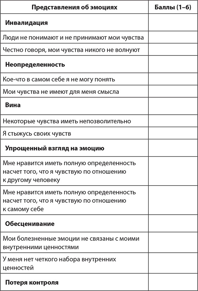 • Представление о потере контроля отражает мысль о том, что сильные эмоции выйдут из-под вашего контроля, поэтому вы считаете, что нужно держать их в строгой узде. Или все-таки вы полагаете, что ваши эмоции всегда остаются приемлемыми, несмотря на то что могут проявляться с разной интенсивностью?