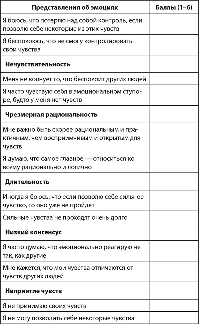 Шкала эмоциональных схемВнимательно прочтите каждое из распространенных представлений об эмоциях, разделенных на 14 категорий. Напротив каждого утверждения проставьте баллы, отражающие то, как вы справлялись со своими чувствами в течение последнего месяца, используя следующую шкалу.