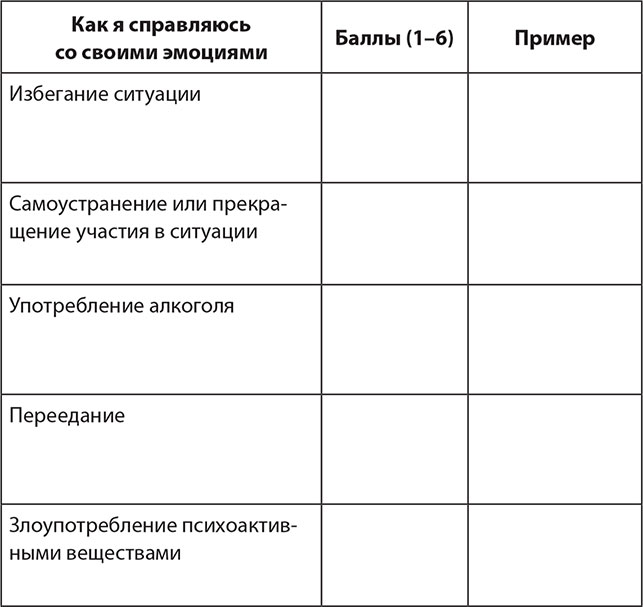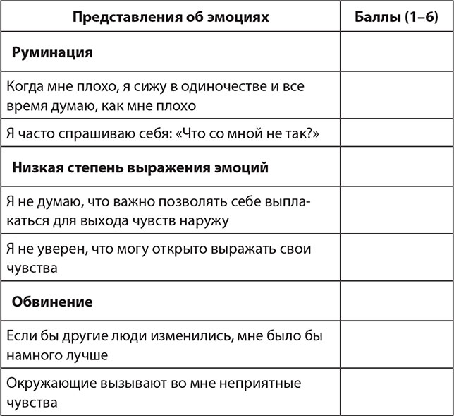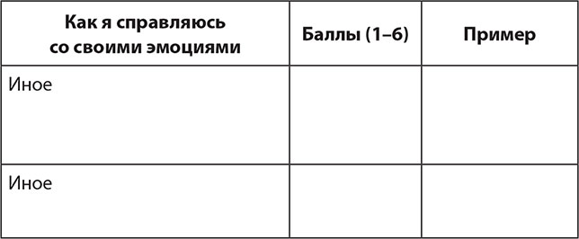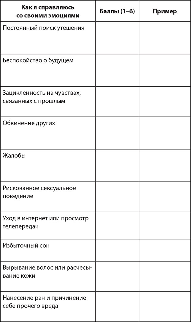 А теперь давайте рассмотрим вашу эмоциональную схему – то есть то, что вы думаете о своих эмоциях и как на них реагируете. Все мы по-разному относимся к своим чувствам, в этой сфере не существует правильных или неправильных ответов. Цель состоит в том, чтобы научиться распознавать бесполезные реакции на свои чувства: это поможет вам выбрать в случае необходимости более полезные реакции на них.