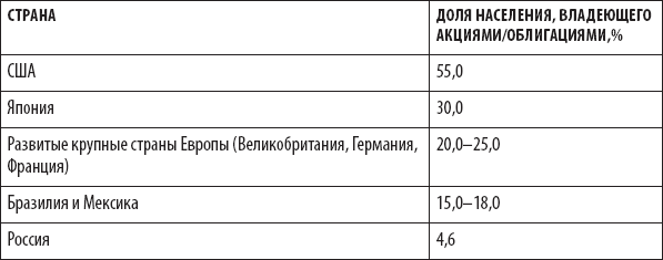 В последние годы в России и в этом плане ситуация стала изменяться в лучшую сторону – процесс освоения финграмотности заметно ускорился. Однако, несмотря на десятикратный рост в XXI в. доли населения, владеющего ценными бумагами, эта цифра пока еще весьма скромна. По сравнению не только с развитыми странами, но и с государствами нашего уровня развития (табл. 1.2). Однако процесс, несомненно, пошел в правильном направлении.