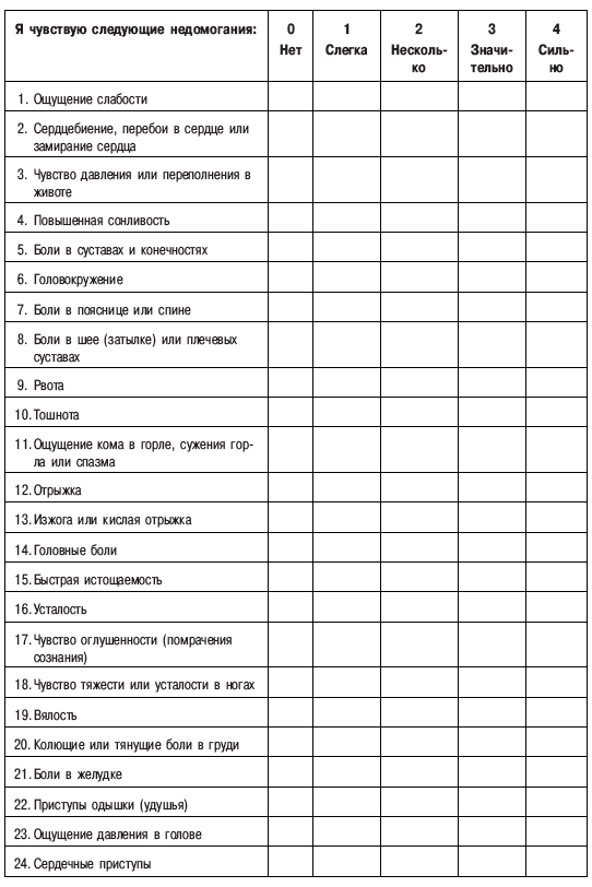 Интенсивность соматических жалобПредлагаем опросник, который выявляет интенсивность эмоционально окрашенных жалоб по поводу физического самочувствия. Опросник разработан в Психосоматической клинике Университета в Гиссене (Германия) и адаптирован в психоневрологическом институте им. В. М. Бехтерева. Отмечаемые недомогания оценивают по шкале: 0 – нет, 1 – слегка, 2 – несколько, 3 – значительно, 4 – сильно. Обработка данных. Вычисляются суммарные оценки недомоганий, составляющих шкалы: